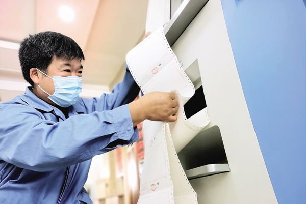 图为南京市浦口区纳税人在自助办税设备上领取发票。