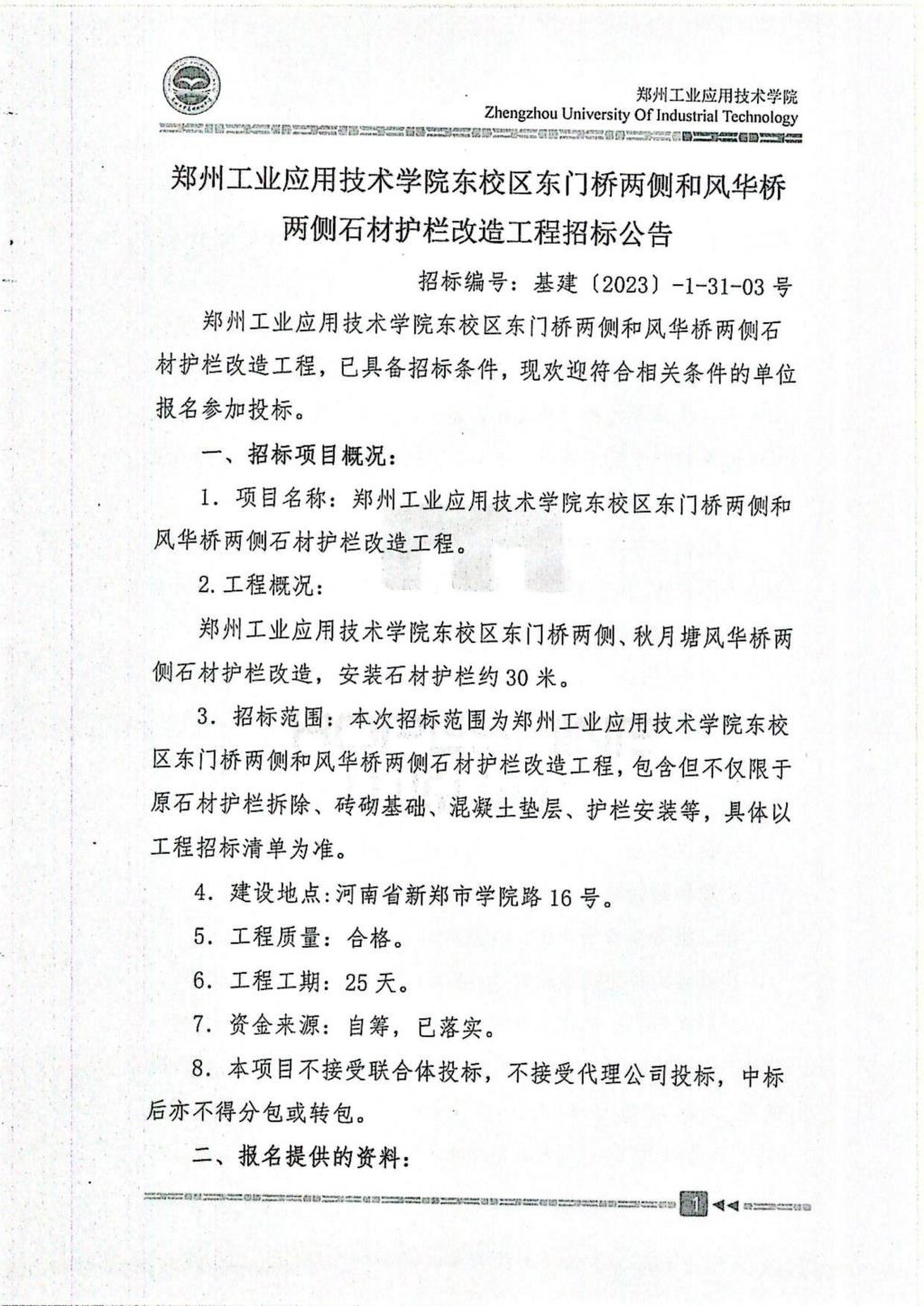 郑州工业应用技术学院东校区东门桥两侧和风华桥两侧石材护栏改造工程招标公告