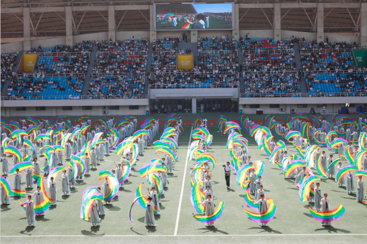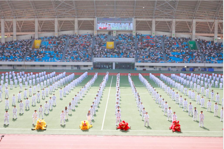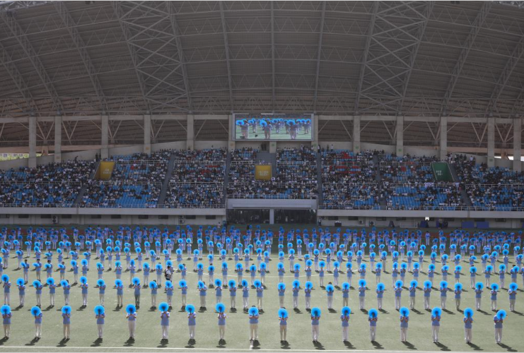 团体操表演中,2000余名大学生分别进行了太极武术、体育舞蹈、艺术体操等精彩节目表演,刚健有力、生动活泼,把运动会开幕式推向了高潮,赢得阵阵掌声,展现了师生们的艺术才华。