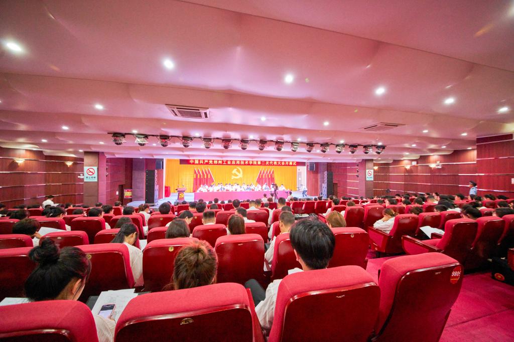 会场气氛庄严热烈,主席台上方悬挂着“中国共产党郑州工业应用技术学院第二次代表大会”的会标,帷幕正中悬挂的党徽熠熠生辉,10面鲜艳的红旗分列两侧光彩夺目。